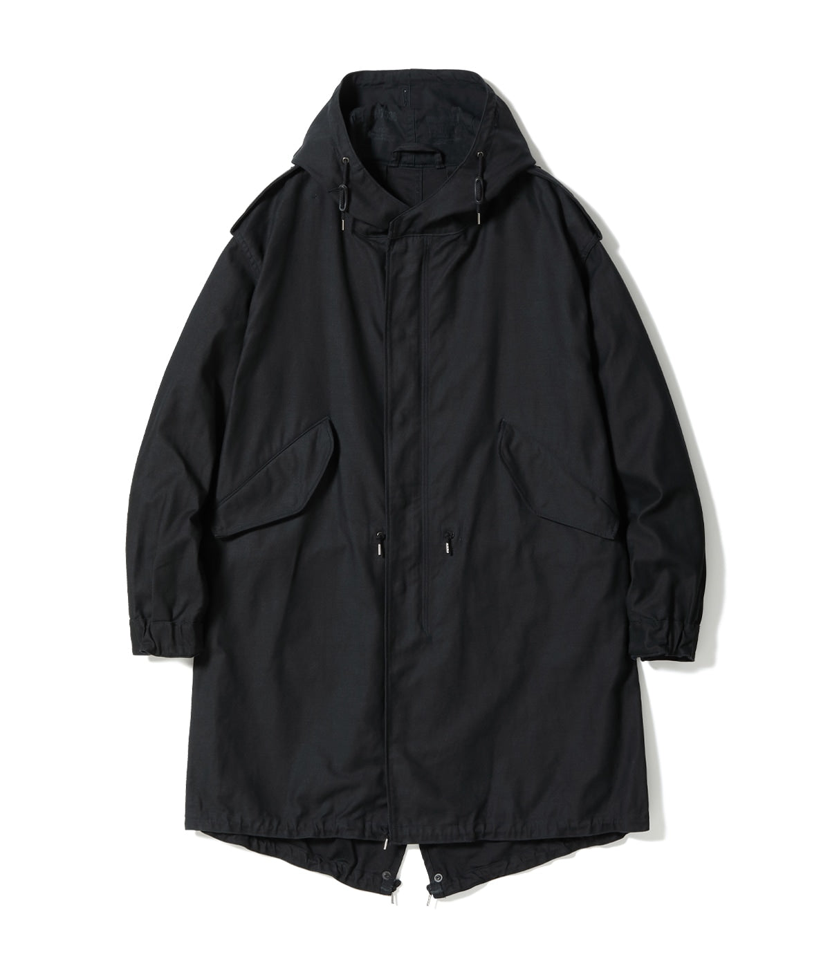 ポケット袋地に用いたウール素材と、袖口のラバーストラップのディテールは官給品と同じ仕様のブラックM-51パーカー。フードのサイズスタンプは一着毎に手押しされる。