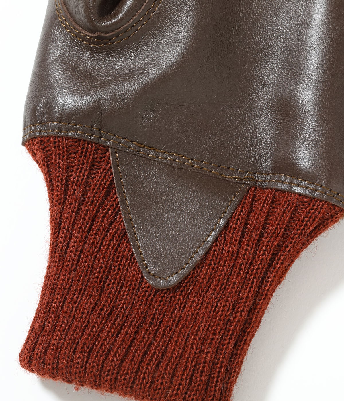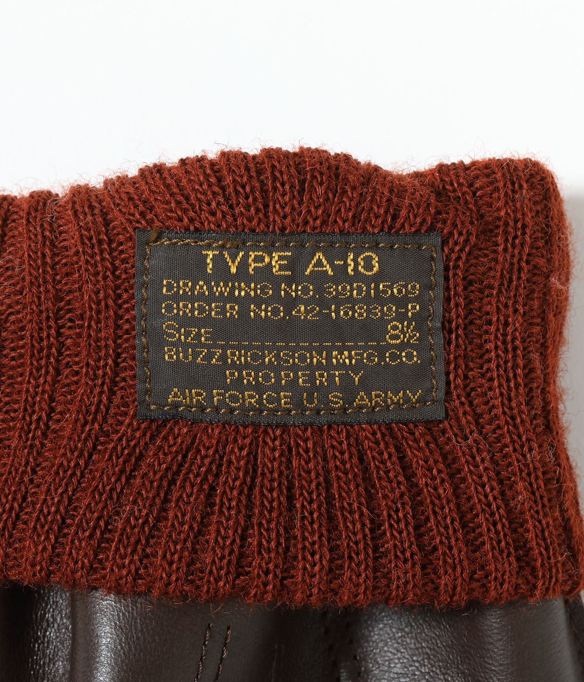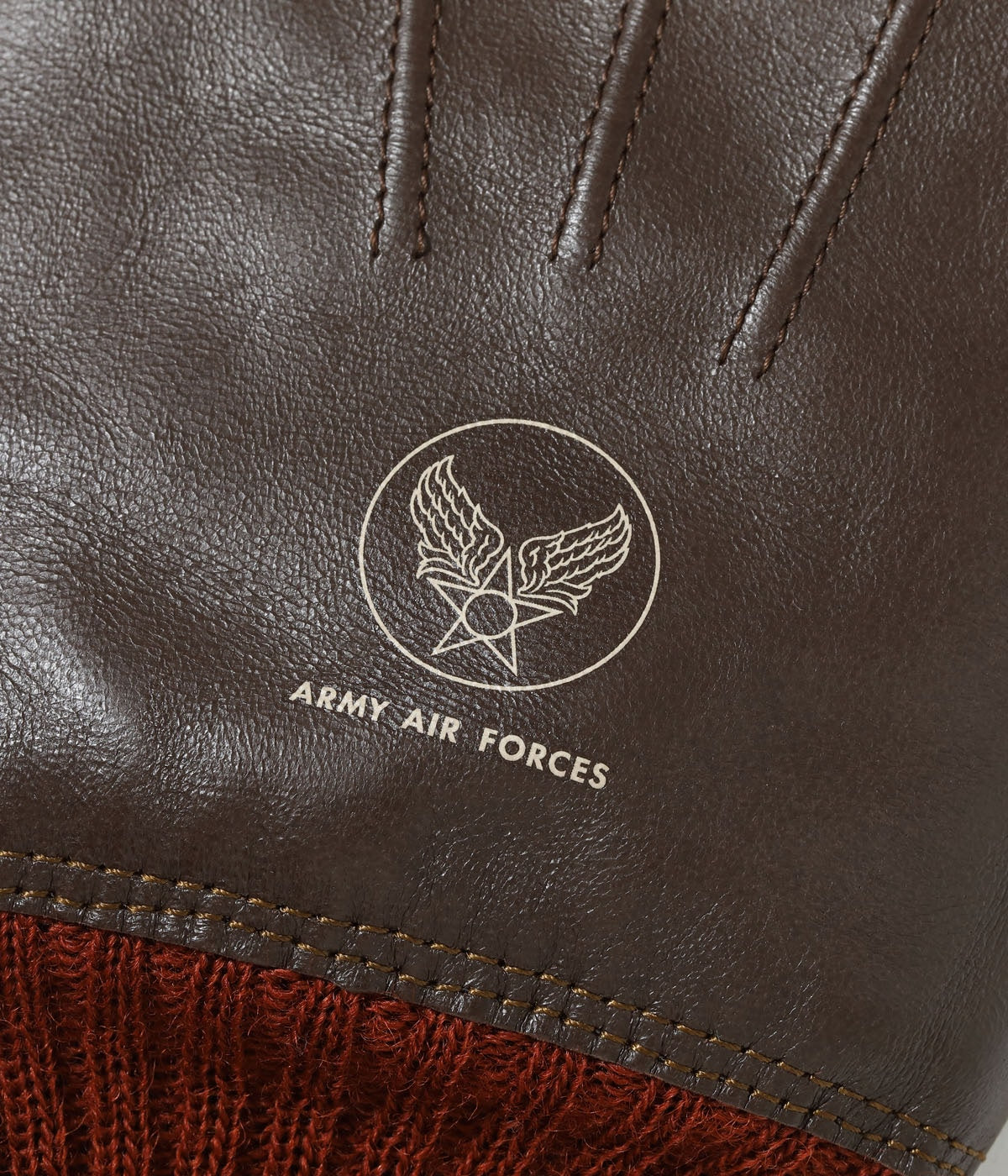 米陸軍航空隊のタイプA-10グローブはパイロットの冬季用グローブとして1938年から採用された。メインマテリアルとなる革はゴートスキンかポニーハイドを使用するよう規定され、ライニングには肌触りの良いウール100%のニットが使用されている。手首にはストレスの掛からないチューブ編みのウールニットが装着され、このニットには着用時に伸びを防ぐ補強用の当て革が縫い付けられている。手の甲に施された3本のステッチは革の伸びを抑え、フィット感を維持するためのディテール。5本の指周りを往復する手の平側と甲側の縫製は高度な縫製技術が要求され、繊細なステッチが時間を掛けて丁寧に縫い上げられたことを物語る。