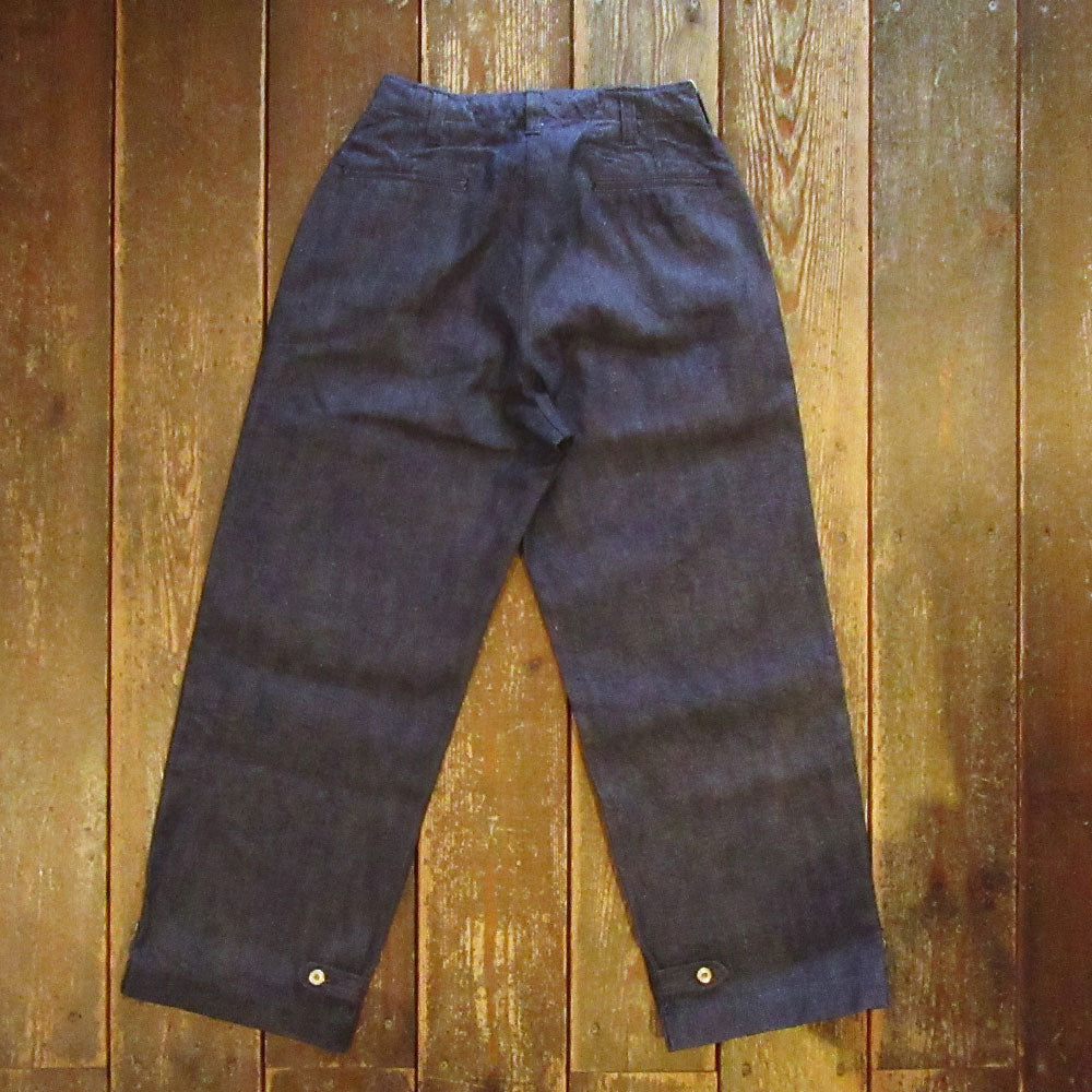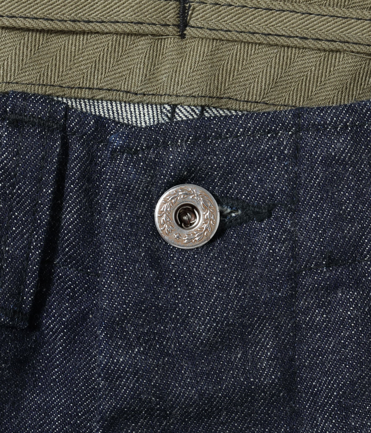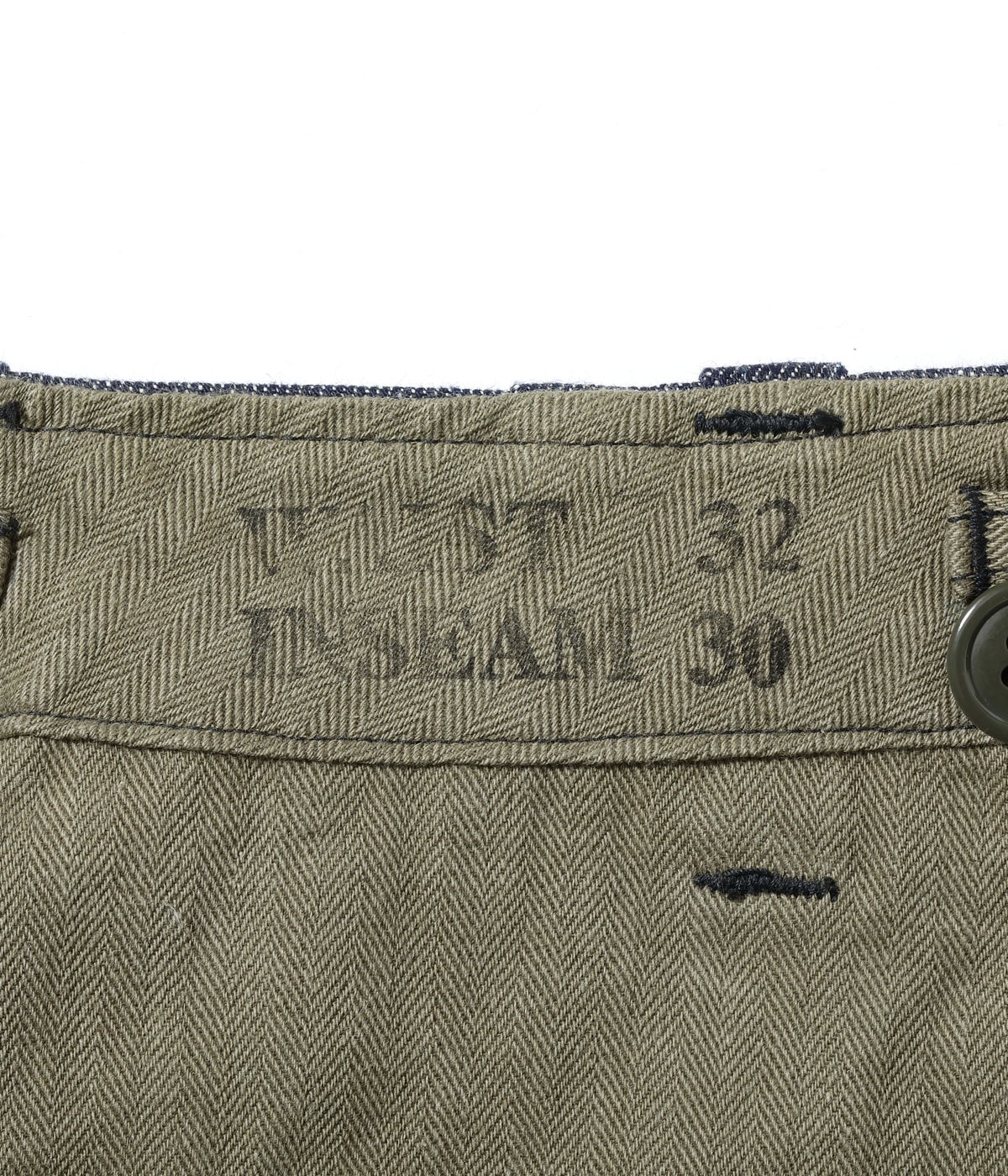 陸軍は全ての環境に対応すべく開発したM-43フィールドジャケットの導入に伴い、セットアップで着用するトラウザースを採用した。ウエスト周りにはサイズ調節可能なタブが付き、ベルトループとサスペンダー用のボタンが設置され、着用の方法を選べる凝った仕様を持っているのが特徴。裾にはタブが付き、ボタンを留めるとジョッパースタイルとなって外気と土や埃の侵入を防いでくれる。軍で実証されたユニフォームは後に民間衣料品として製造されるようになった。特にワークウェアで使用されるタフな素材のデニムを仕様するケースも少なくは無かった。擦れや摩擦で表情が美しく変わって行く過程はいつしか愛着という言葉が相応しくなる。