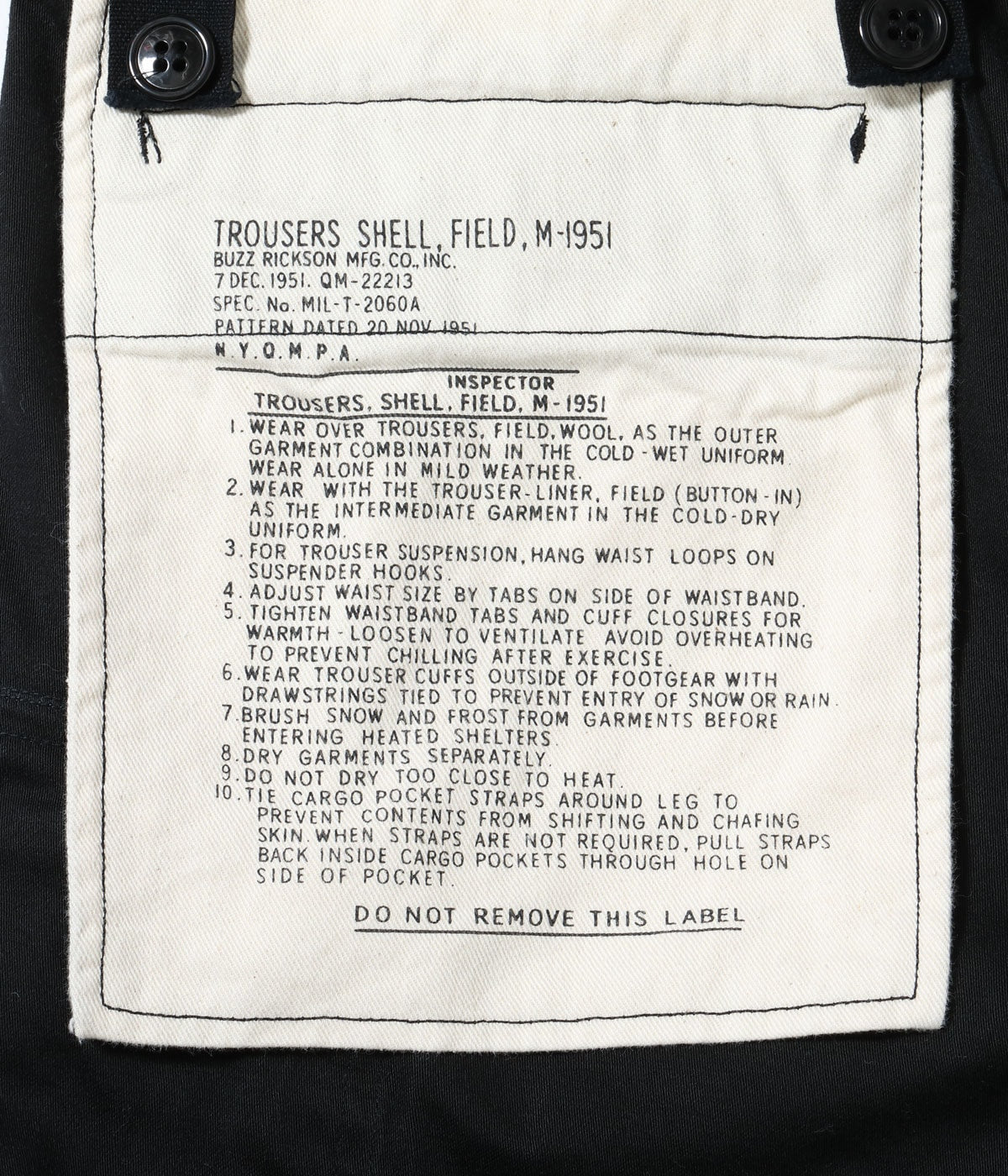 米陸軍が1951年に採用したコットンサテン地を裏使いしたフィールドトラウザース。陸軍はこの頃、寒冷地用の戦闘服としてM-51シリーズのセットアップレイヤードシステムを採用した。アンダーシャツ、ドラウァー(ズボン下)を履いた上にウール製のフィールドシャツとフィールドトラウザースを着用し、更にその上からコットン製のフィールドジャケットとフィールドパンツを着用した。いずれのM-51も寒冷地での着用を考慮し、ルーズフィットにすることで体温を閉じ込め、外気を遮断する効果を重視している。ウエスト内側に設けられたコードループは、サスペンダーの先端に付いた金属製のフックを引っ掛けるためのディテールである。