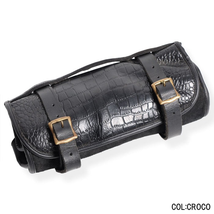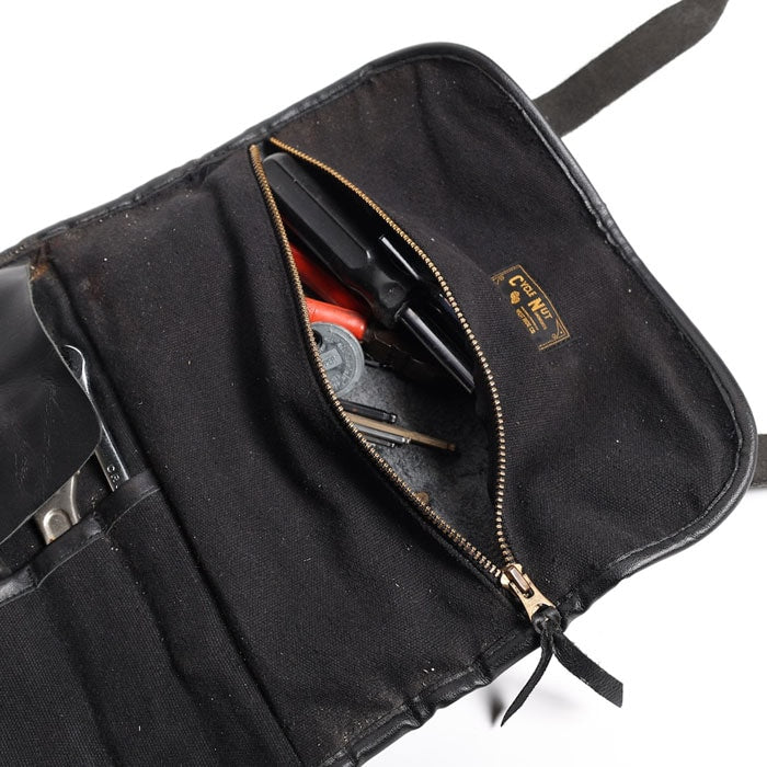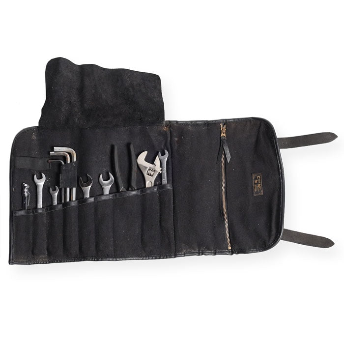 ブラス製ローラーバックルバックルを採用した使い込む程に経年変化が楽しめるツールロール。様々なツールを分けて収納可能なツールポケットは当然ながら、落下防止のフラップや、書類入れとしても使えるジッパーポケットなど、長年に渡るバイクライドの経験値から製作した、バイクに必要なツールを全て収納できるサイズ感のバッグです。