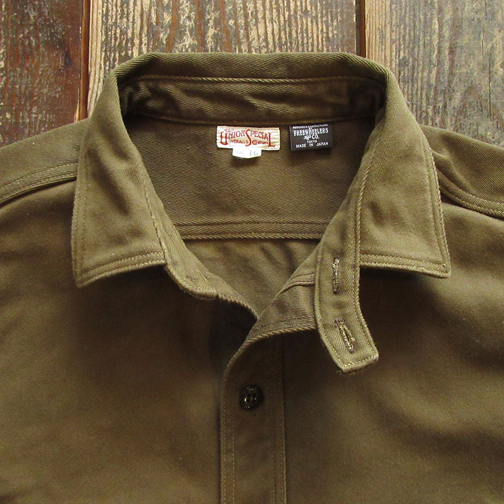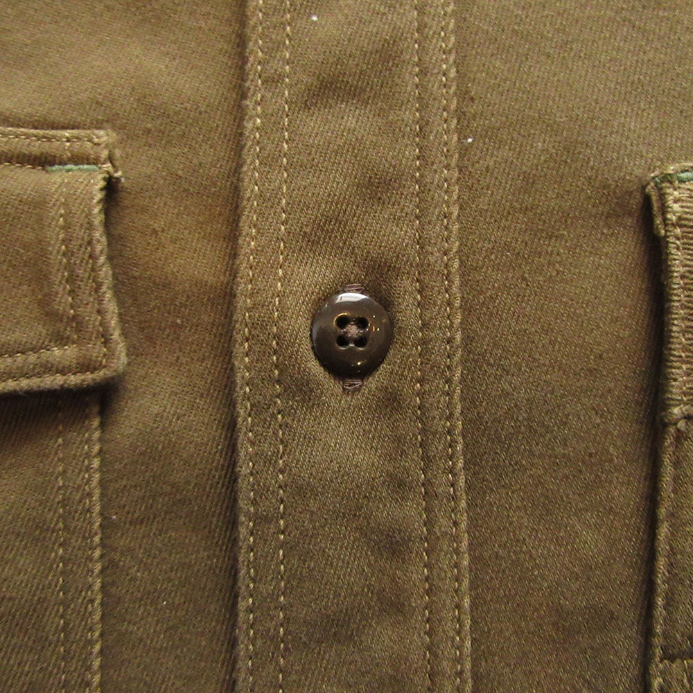 襟にはチンストラップ付き、ポケットは左右非対称になり右側はフラップ付き、左側は二重ポケットとなります。尿素ボタンを使用。着丈も程よく肉厚な生地感なのでシャツとしてはもちろん、シャツジャケットとしても着こなせる1枚です。