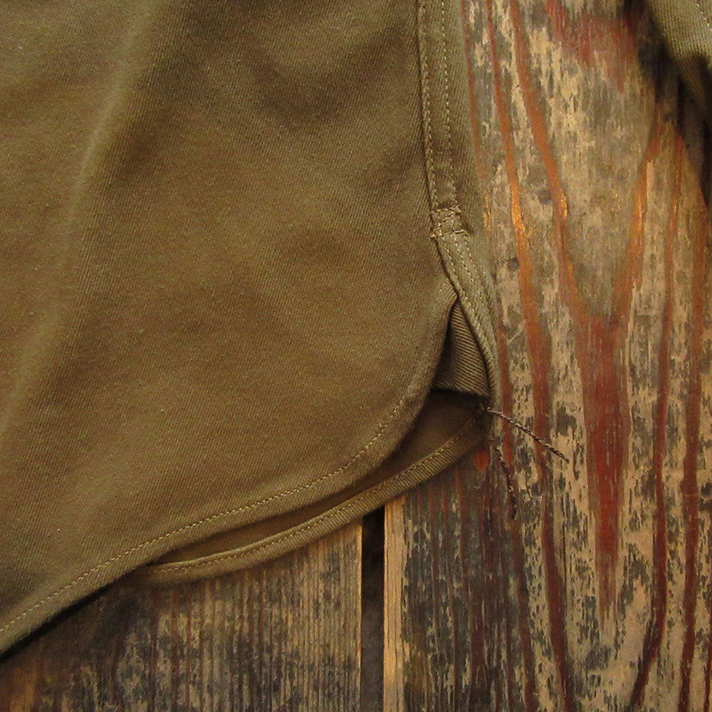 太番手の強撚糸で高密度に織られたカルゼ生地を使用。綾目の際立つ重量感・ハリコシ感のある、表面を毛焼き処理したクリアな仕上がりの生地です。着用頻度により生地が馴染み柔かくなります。経年変化により、ビンテージ感のある雰囲気に変化していきます。
