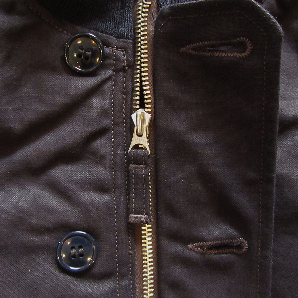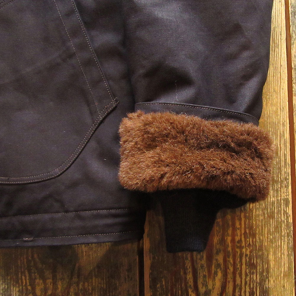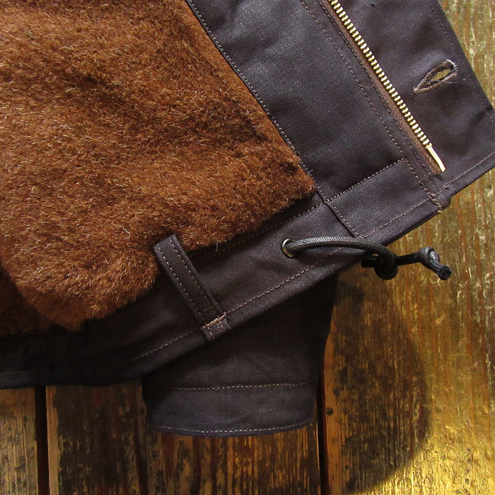 高密度に織られた“Original Cotton Duck”を使用。ハリコシがあり硬くてがっしりとた生地感です。着込むことによって褪色感等ビンテージの様な風合いが生地に変化していきます。裏地は大変貴重で贅沢な天然アルパカ原料を100%使用しています。 色は天然の赤茶色で、ウール混のものと比べ、柔らかく肌触りの良い質感が特徴です。また、防寒性を考慮し表生地とライニングの間にコットンフランネルを挟み、より保温性、遮風性を高めた3層構造の仕様になります。襟、袖口にはウールリブ、ジッパーは扇形ジッパーが使用され、ボタンには尿素ボタンが使用。左内側に内ポケット付き、脇下にはアイレット、裾にはワックスコードのドローコードが付きます。