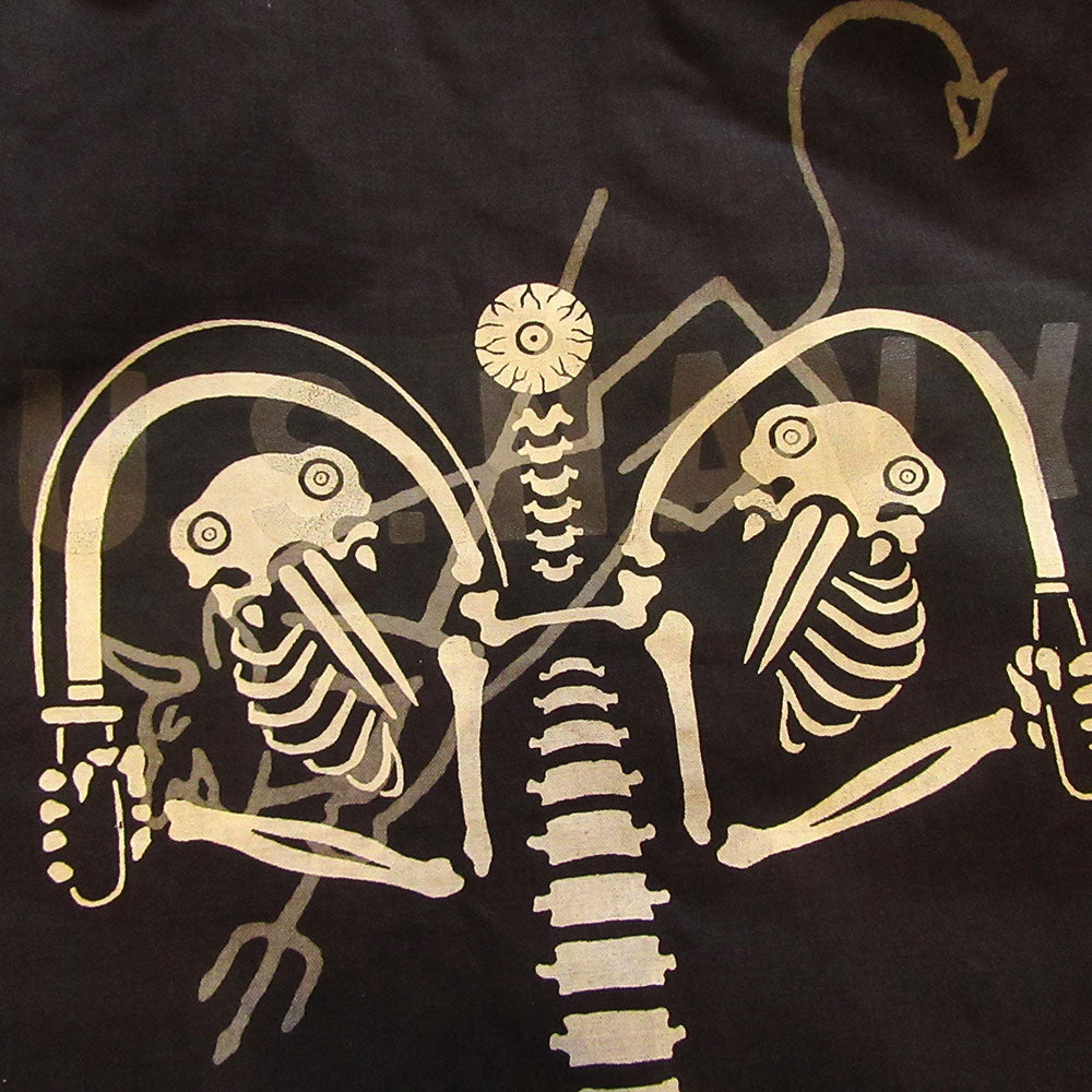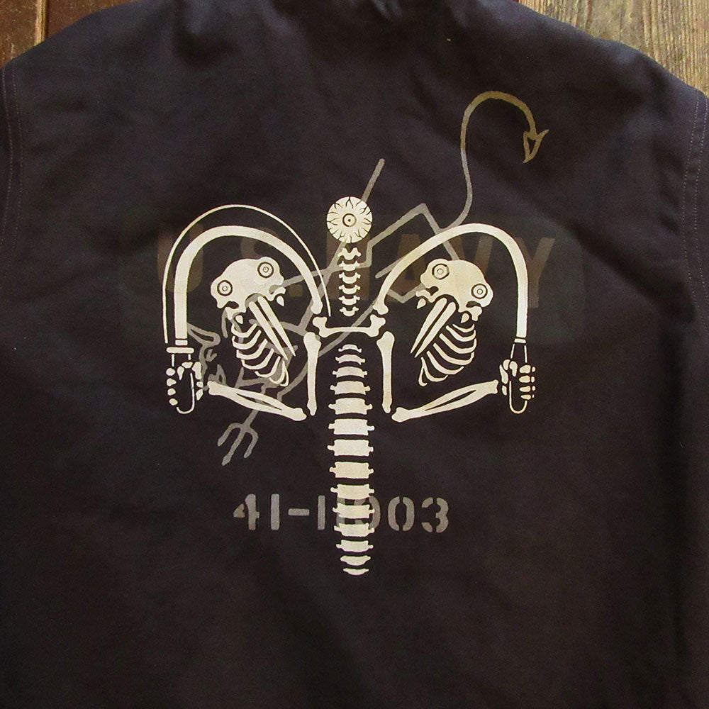 こちらのカスタムモデルは右胸にフェルトパッチ、左胸にはラバープリント、バックはU.S.NAVYのリフレクタープリントを黒で塗りつぶした上に爆弾モチーフのノーズアートをプリントし、更にその上にバイクモチーフのプリントが施された非常に凝った仕様になります。