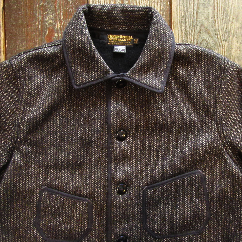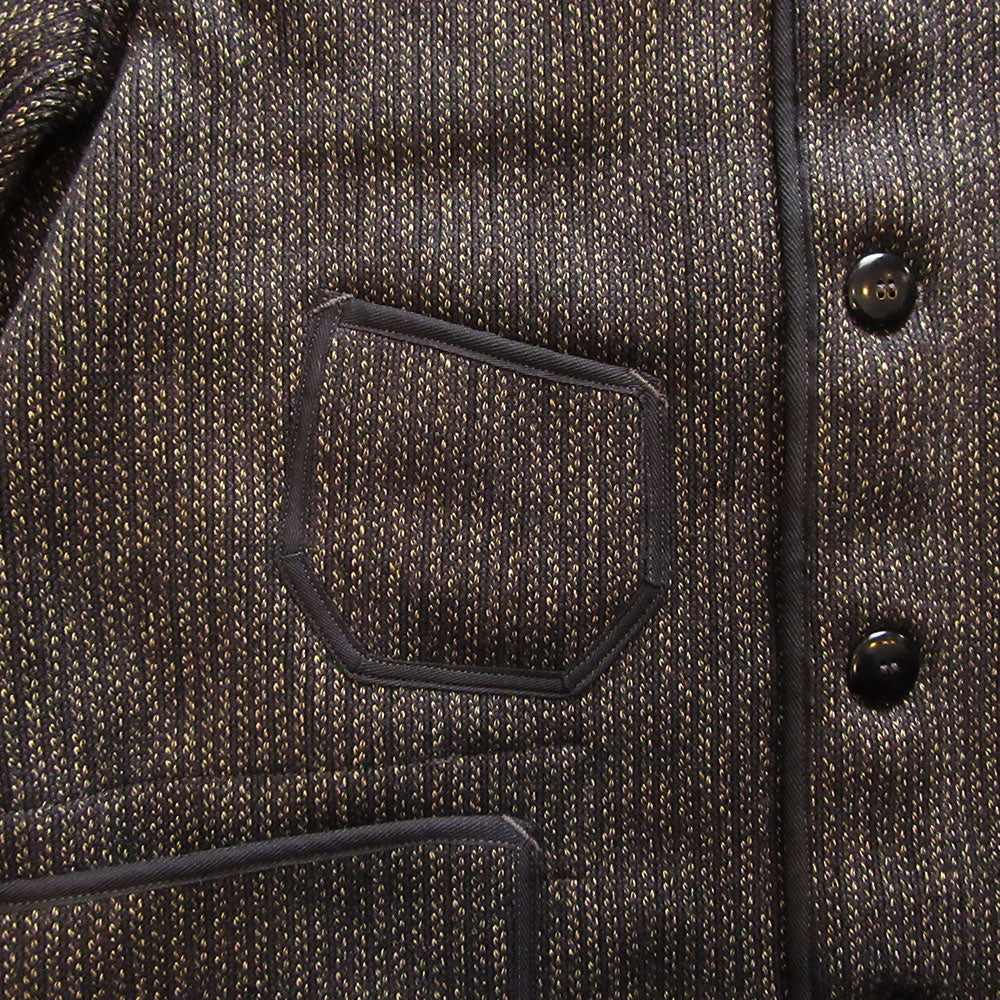 ラッセル織機を使用しコットン/ウールで織り上げられたフリーホイーラーズオリジナルのビーチクロス生地を使用。肉厚で暖かみのある、ストライプにも見える生地感が特徴的です。胸ポケットは左右非対称、腰ポケットはやや脇に寄った配置になり、ポケット口裏側にモールスキン生地による補強が付きます。襟裏には起毛されたモールスキンを使用しています。ボタンはナットボタンを使用、各所パイピングにはヘリンボーンテープを使用しています。