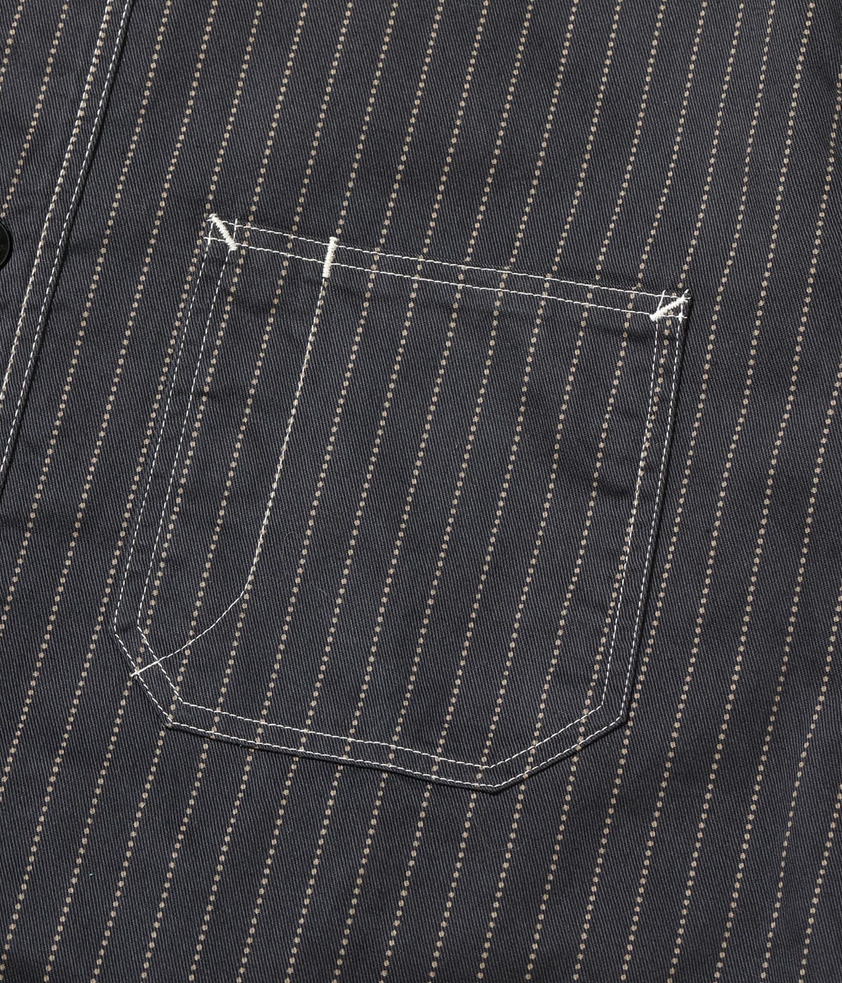 20世紀初頭に存在したものの、ヴィンテージで見つけることはインディゴブルーよりも困難なブラックウォバッシュストライプ。ブラックの硫化染料でベースを染めたあとに抜染でドットストライプをプリントしている。現存するヴィンテージから色を起こしたため、やや褪色した色味で仕上げている。