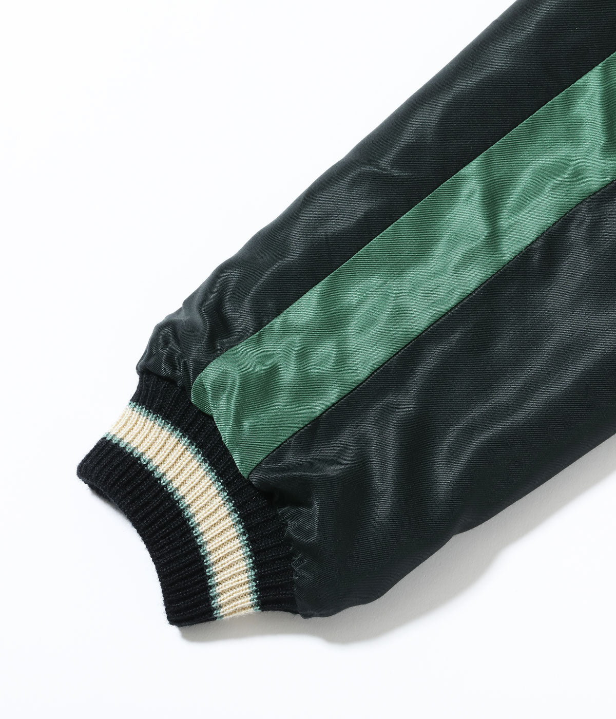 リバーシブル面は、身頃より袖下の色の方が濃い「逆配色」。グリーン×ブラックのダークトーンのボディには、金龍に使われているイエローや淡いピンクの色糸が映える。