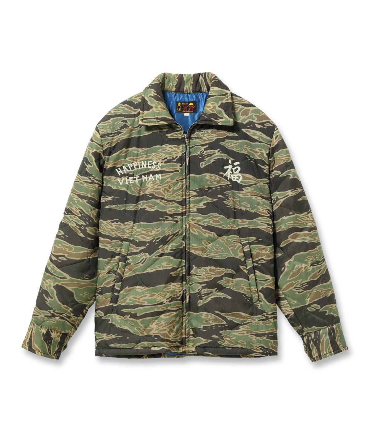 ベトナム戦争時、米軍の軍港が置かれた都市NHATRANG(ニャチャン)。1960 年代中期にその激戦地へ駐留していた兵士のカスタムオーダー品。背中は王道のマップ柄だが、このように白一色で刺繍されたベトジャンはヴィンテージでも珍しい。表地は瓢箪型のキルティングが入ったミリタリー由来のナイロンリップストップ。裏地には着心地を考慮してサテンが使われ、中綿入りのため適度な防寒性も備えている。通常、ライナー生地はウッドランド迷彩だが、本作はタイガーストライプを落とし込んだオリジナルモデル。