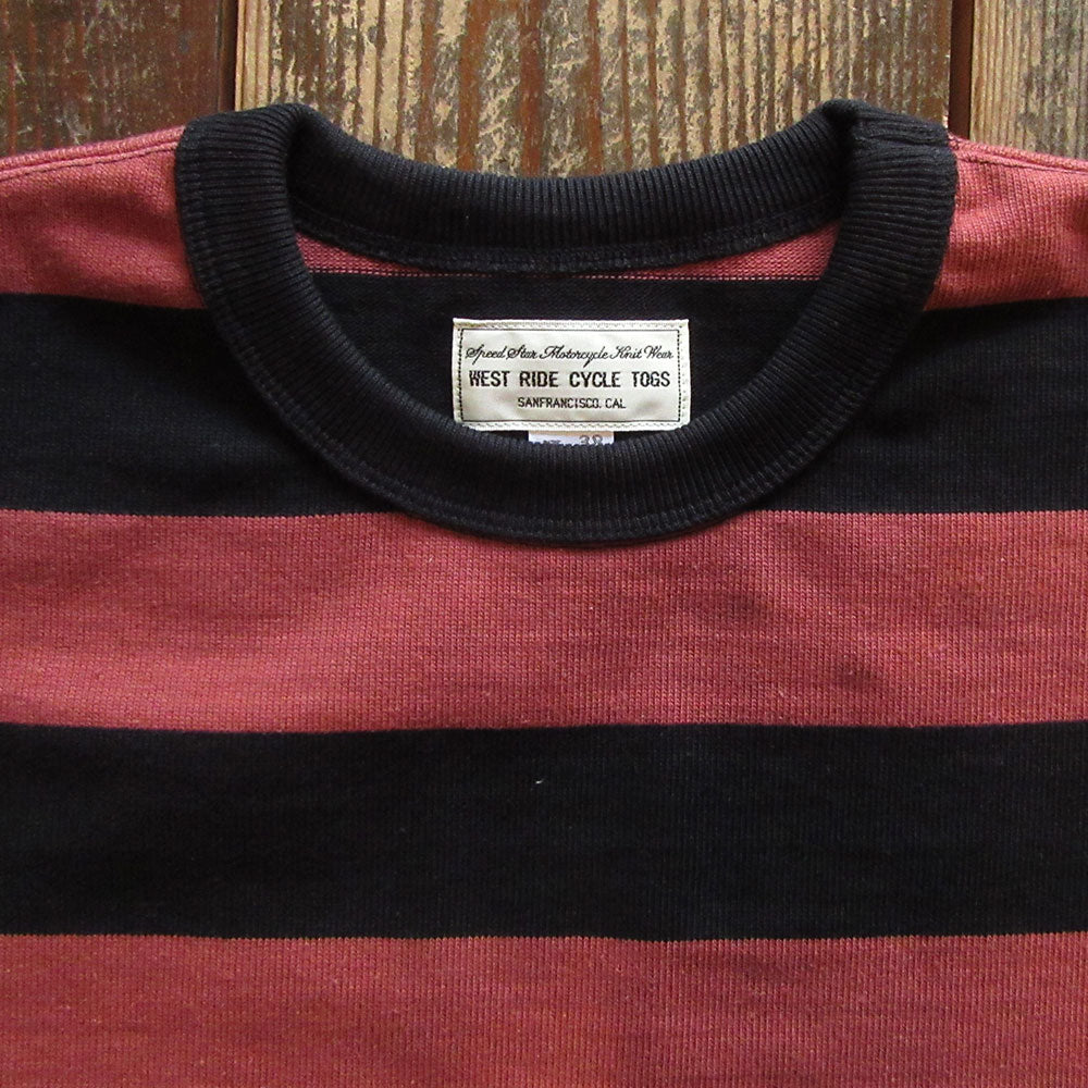 WESTRIDEボーダーシリーズの大定番であり看板商品。ボーダー幅は約5㎝(2インチ)。このピッチはアウトローボーダーTEEの最もオーソドックスなスタイルと言われる。WESTRIDEとしてはブランド創立の2003年からボーダーLS TEEを展開。当時はアメリカのニット工場で別注生産していたが、製品の品質に若干のバラつきがあった為、生産を日本国内へシフト。その際に、バイカー向けのタフで頑強なものを作るという理念で生地作りから模索。そのプロセスで取得したのが現在使用している、引き揃えという手法。10番手の太い糸を2本平行に引き合せ、編み機の針穴に揃えていれ、編み立てていくことで、頑強な生地を作り出している。また同時に、生地には独特のザラ感が生まれ、着用感にも優れている。また、型崩れもない。この特殊製法によるオリジナル生地は非常に人気のある、ウエストライドならではの生地となっています。生地裏面に起毛加工を行わないため、より長いシーズンでの着用が可能となっています。