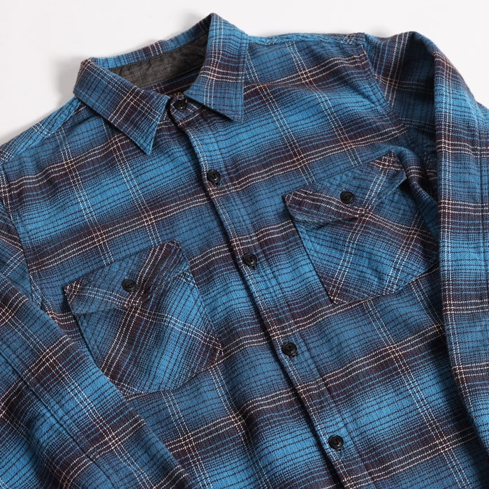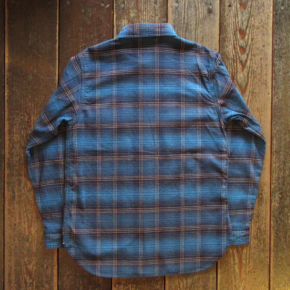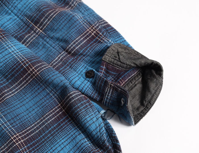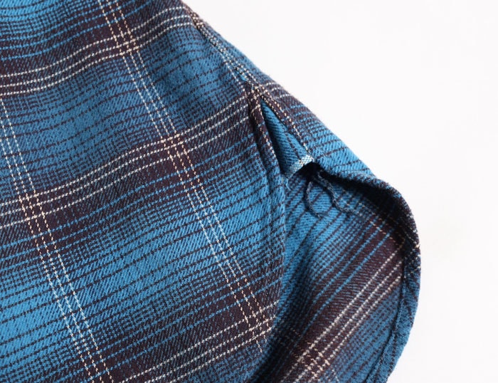 BLUE CHECK: COTTON100% 経糸緯糸に20番双糸を用いたオンブレチェック柄。トーンを変えた3色のBIUE糸によって色の変化を加えた完全オリジナルのミディアムウェイトネル。