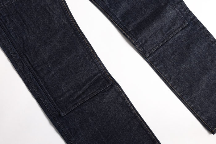 ダブルニーの5ポケットなる外見のパンツをユニークな作りで仕上げたリニューアル新作。14ozムラ糸耳付きデニムブルーとブラック・Wブラックを使用し、最大の特徴はポケット下のダブルニー部分のみに内蔵されたCFMX 80ℊ防風防寒素材。外観からは「暖かさに繋がるギミック」が一切見えることなく、最低限の保温性を確保。「TOO PROUD TO GIVE UP=諦めるにはプライドが許さない=やせ我慢」という洒落たネーミングの一本は程好くゆとりあるシルエットでライディングは勿論、タウンユースの着用にもお勧め。ウエスタンループを始め、ダブルステッチとトリプルステッチを各部によって使い分けるなどWESTRIDEならではの拘りと作り込みも満載。