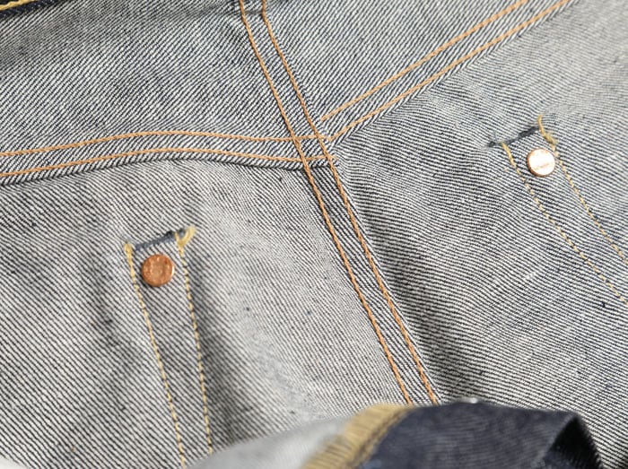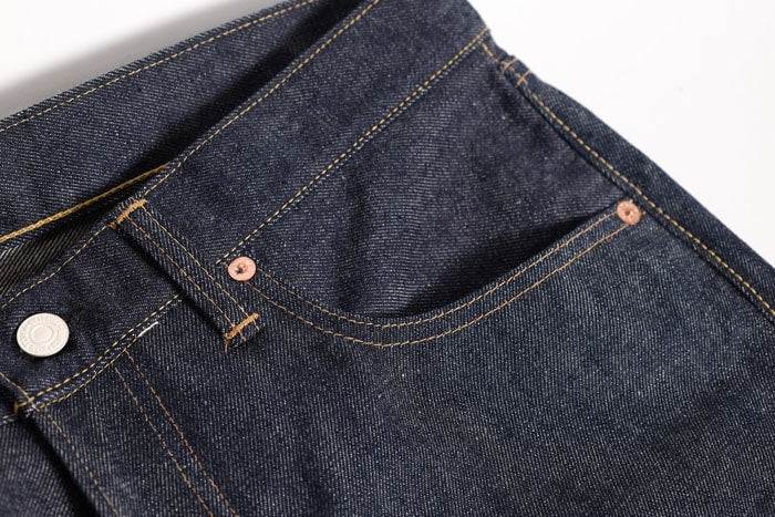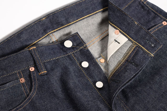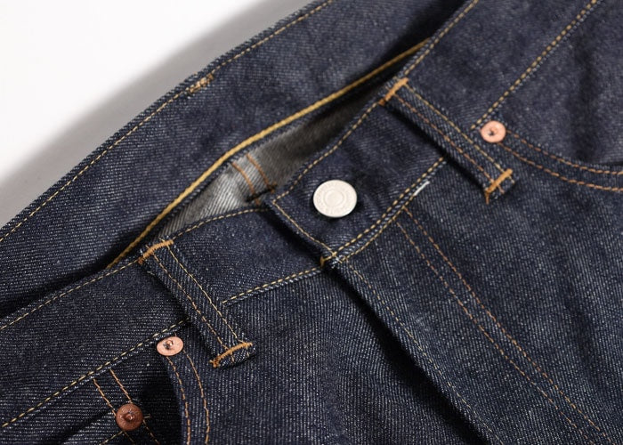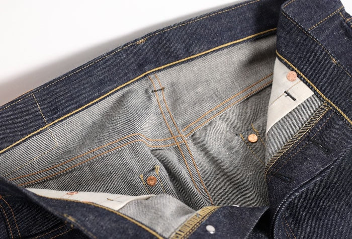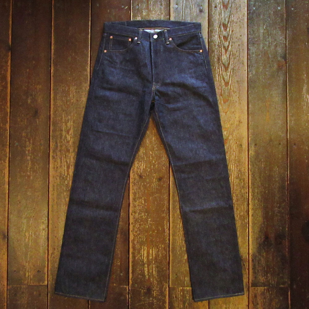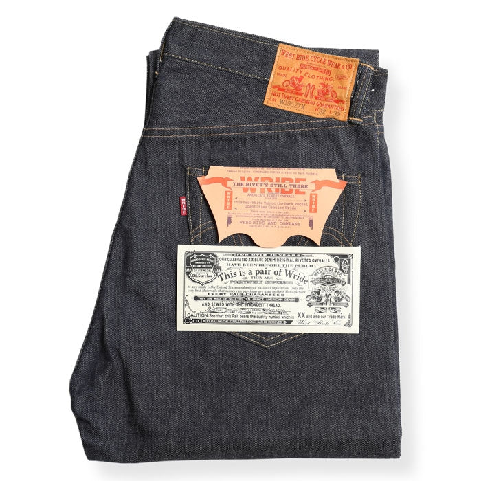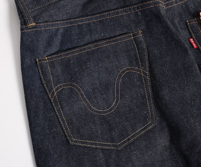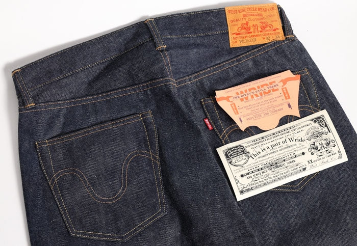 WH社の3州ブレンド糸のバナー・デニムによるセットアップは片面後期の1952年モデルで作り込んだXXとJXX。金茶を多用したレインボーステッチになり、ボトムはW1948XXと比較し、ややスッキリとした美しいシルエットを持つ極上の一本。コインポケットは耳使い。ボタンはWESTRIDEオリジナルとなり、各部リベットはWH製。バックポケットにはフリーハンドのHERRINGS BAR STITCHが施されています。ジャケット・パンツとも限定品となります。